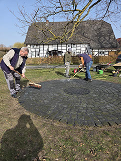 In diesem Jahr wurden auch wieder die Holzstraßenschilder und die Bänke in Augenschein genommen, damit weitere Arbeitseinsätze vom Vorstand geplant werden können. In einer vom Verein organisierten Aktion wurden auch an diesem Tag die Pflastersteine unter den Eichen gereinigt und neu versiegelt.